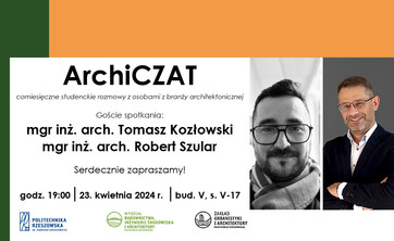 Studenckie Koło Naukowe Architektury Miejsc Społecznych Politechniki Rzeszowskiej zaprasza w dniu 23. kwietnia 2024r. na kolejne spotkanie z cyklu wydarzeń ArchiCZAT.