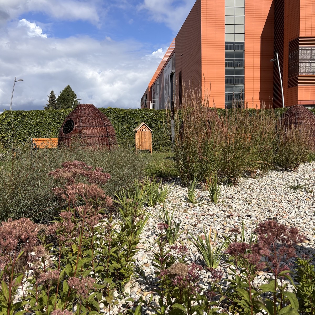 Opis do zdjęcia: Rzeszów, Nowe Miasto ul. Rejtana. Zdjęcie przedstawia fragment ogrodu deszczowego o przepuszczalnej nawierzchni oraz elementy placu zabaw z naturalnych materiałów.